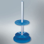 Moulded in Polypropylene, chis unique Stand holds a maximum of 94 pipettes and rotates on a central vertical axis for convenient selection of any particular pipette. The lower rotating disc has four concentric troughs with capered sides and open bottoms which cradle the pipette rips protectively and permit water drops to run off.