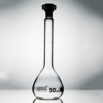 A volumetric flask (measuring flask or graded flask) is a type of scientific glass ware that is designed to contain an exact volume at a certain temperature. Volumetric flasks are utilised for accurate dilutions and standard solution production. These flasks are typically pear-shaped, have a flat bottom, and are constructed of glass or plastic. The opening of the flask is either equipped with a plastic snap/screw cap or with a joint to allow a glass stopper. Volumetric flasks have an extended and thin neck with an engraved ring graduation indication.